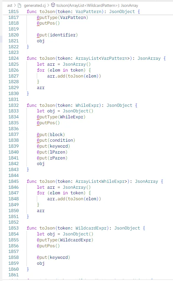 astexplorer 是一个用于可视化 AST 的工具,支持多种语言。我们将仓颉的 AST 转换为 JSON 后,在 astexplorer 中可以方便地查看。鼠标可悬浮在对应位置跳转到语法树,反之亦然。
