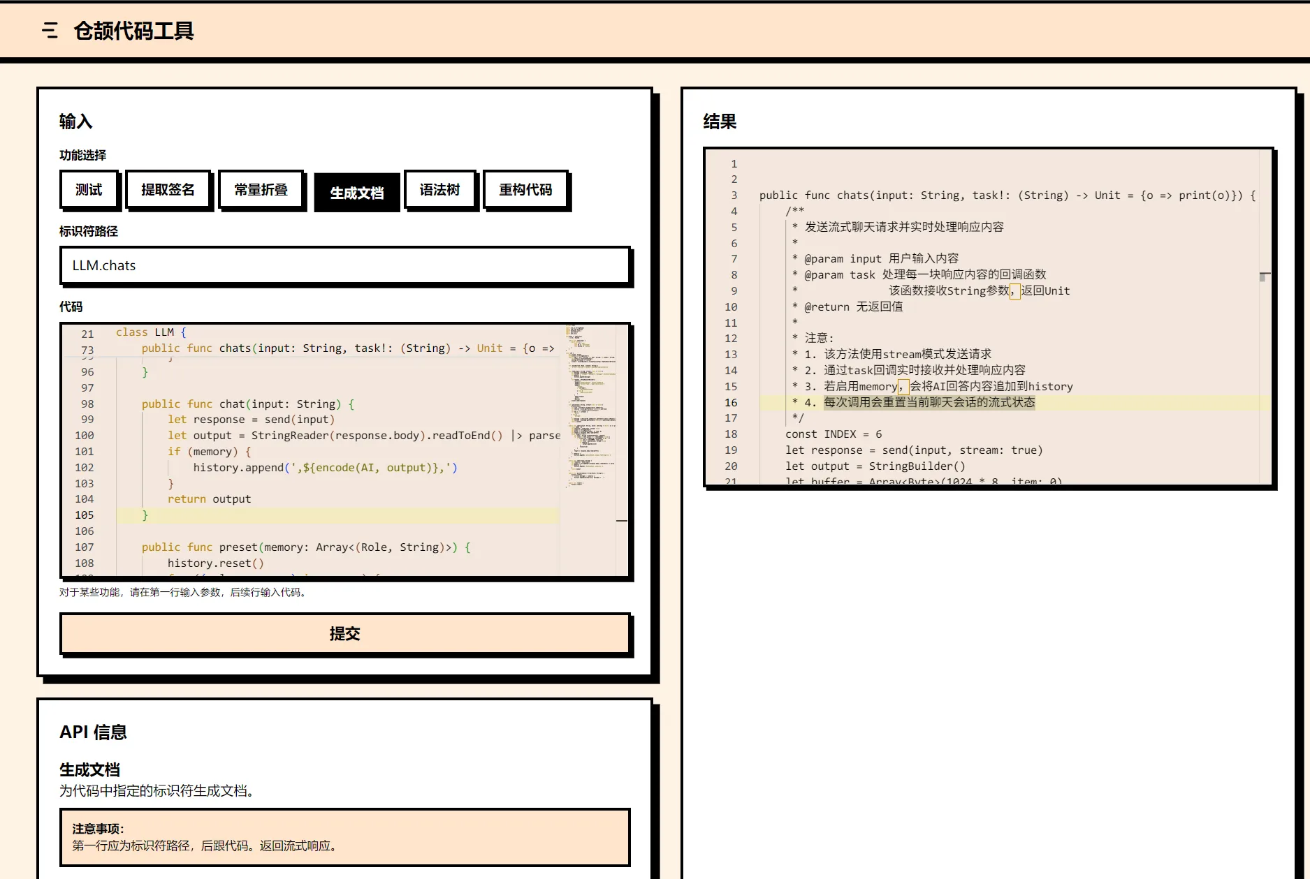 这是《仓颉语言程序设计》课程的大作业的实现。大作业要求使用仓颉语言开发一个运行在服务端的仓颉代码工具,实现对仓颉程序的简单语法和语义分析,同时使用前端语言设计一个简单的图形界面,在浏览器实现对代码工具的调用。这个作业主要内容就是操作仓颉代码的 AST。
